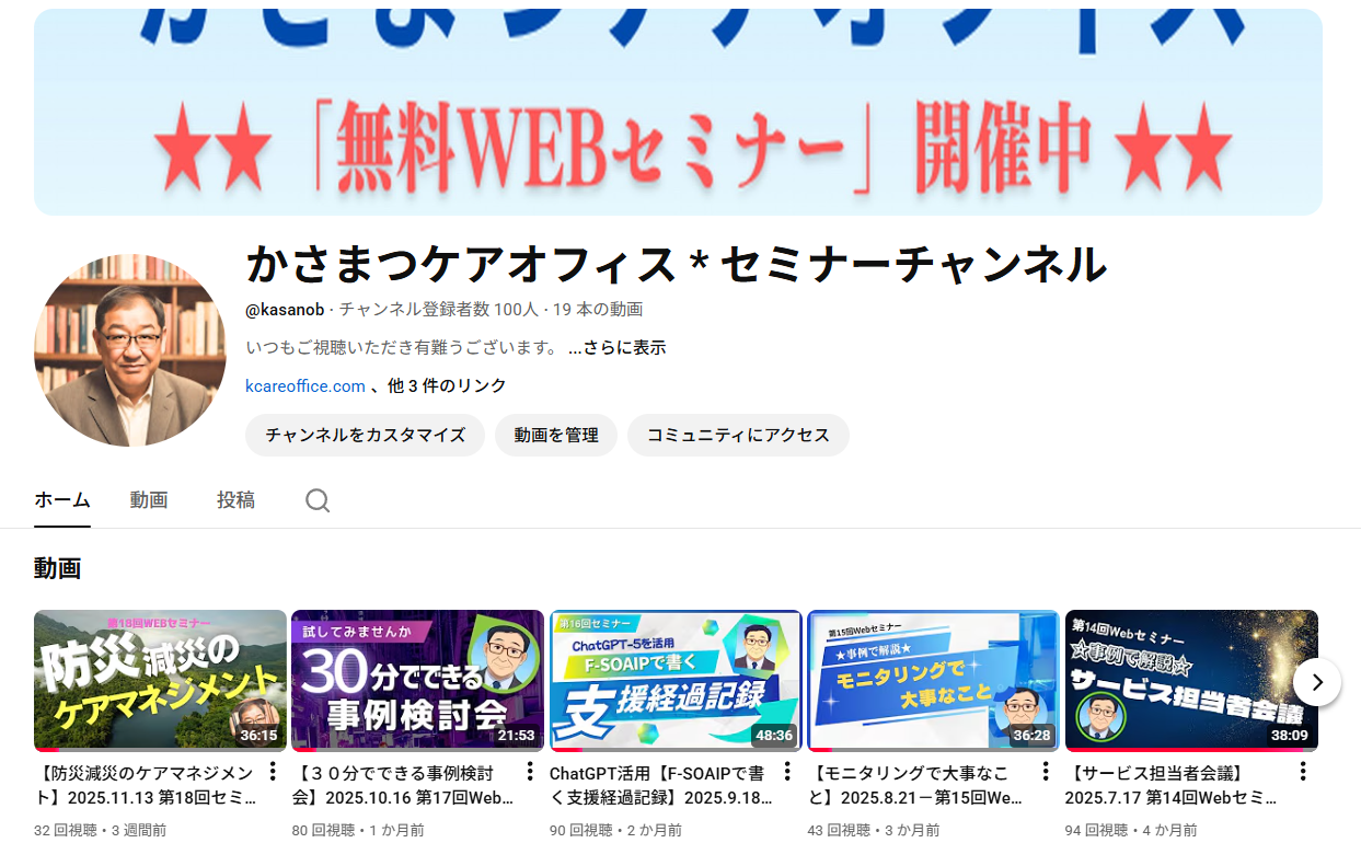 毎月開催する「無料Webセミナー」の録画版、ケアマネジメントの情報、防災・減災の話題が載っています。